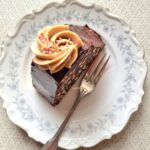 Sarapuupähkli biskviit, kohupiimakreem, virsikukompott ja šokolaad
