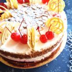Kakao-või biskviidiga ja vahukoore ning kirssidega klassikaline tort Sisaldab nisujahu, piima, shokolaadi, soja