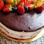 Toorjuustu vahukoore kreemiga tarretatud tort on kaunistatud hooajaliste marjadega Sisaldab nisujahu, piim, muna
