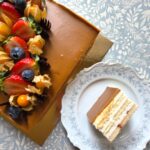 Rikkaliku kohupiimatäidise ja puuviljadega tort, Liivataigna ja biskviitpõhjaga. Sisaldab nisujahu,piima, muna, mandleid