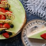 Mandlibiskviidiga ja pistaatsia keedukreemiga mahlane tort ,Magusust tasakaalustab vürtsikas mustasõstrazelee. Sisaldab mandlijahu, piima, muna, shokolaadi, soja, pistaatsiapähkel